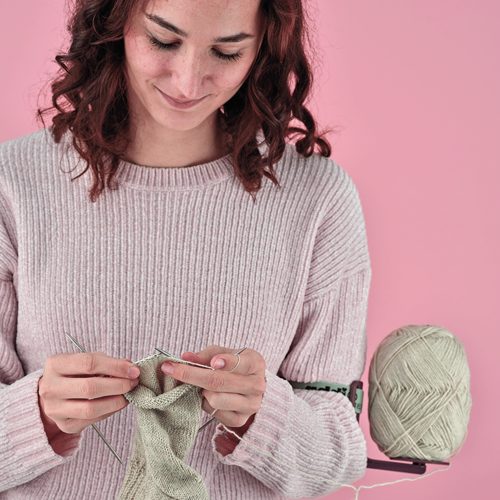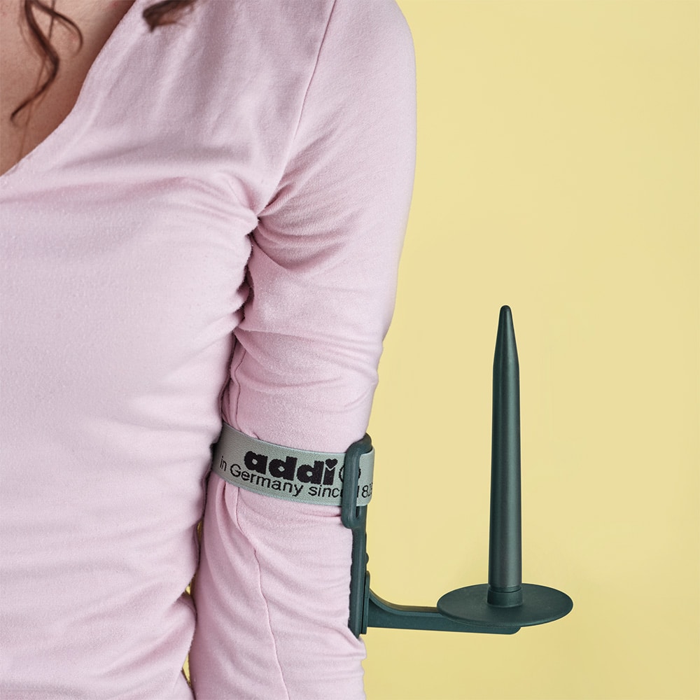 Jederzeit und überall stricken und häkeln! Mit dem patentierten addiYarnArm wird Stricken und Häkeln einfach entspannter – keine verhedderten Wollknäuel mehr in der Tasche oder auf dem Boden – auch nicht unterwegs.