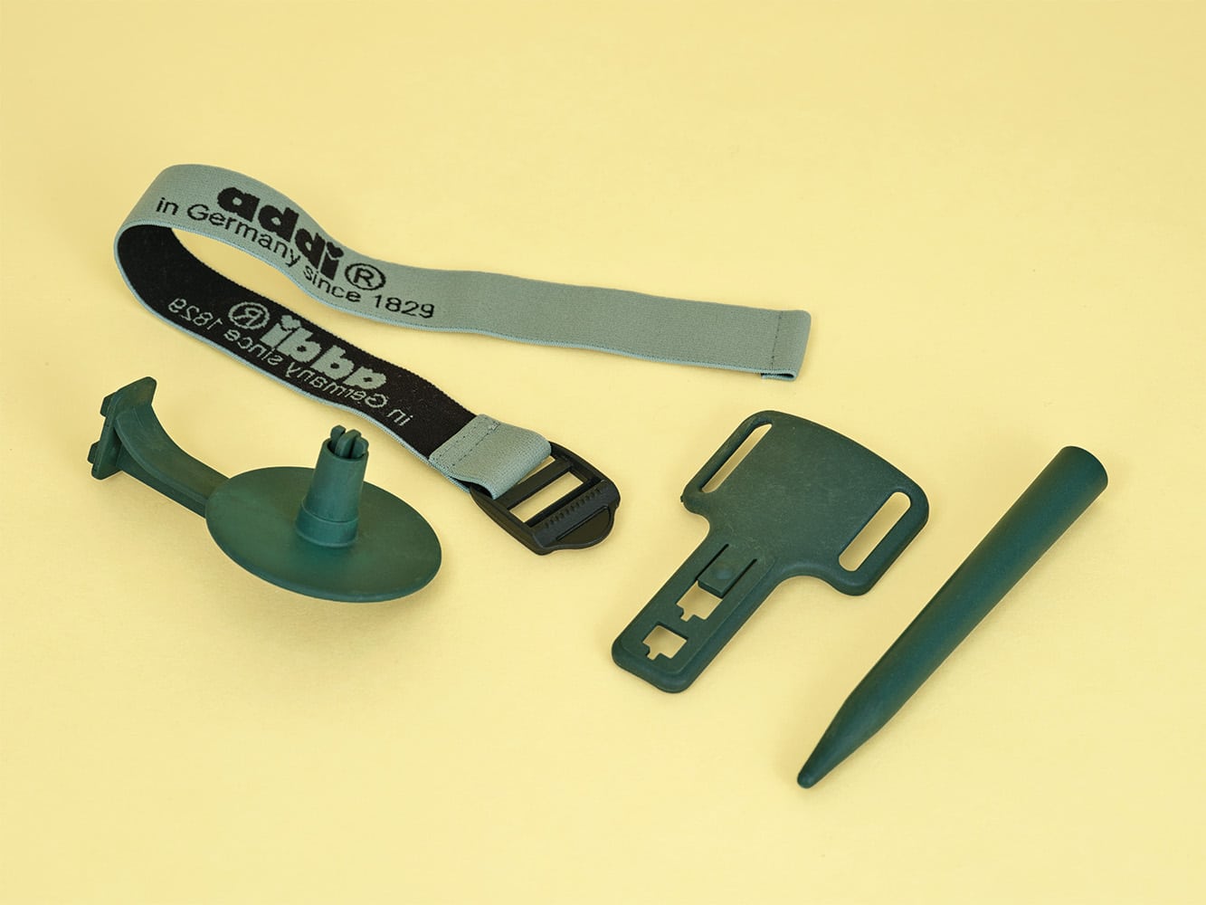 Inhalt: addiYarnArm (Gummiband, Garnstift, drehbare Platte, Armbefestigung) + Aufbewahrungsbeutel