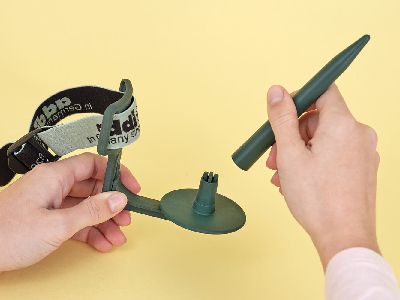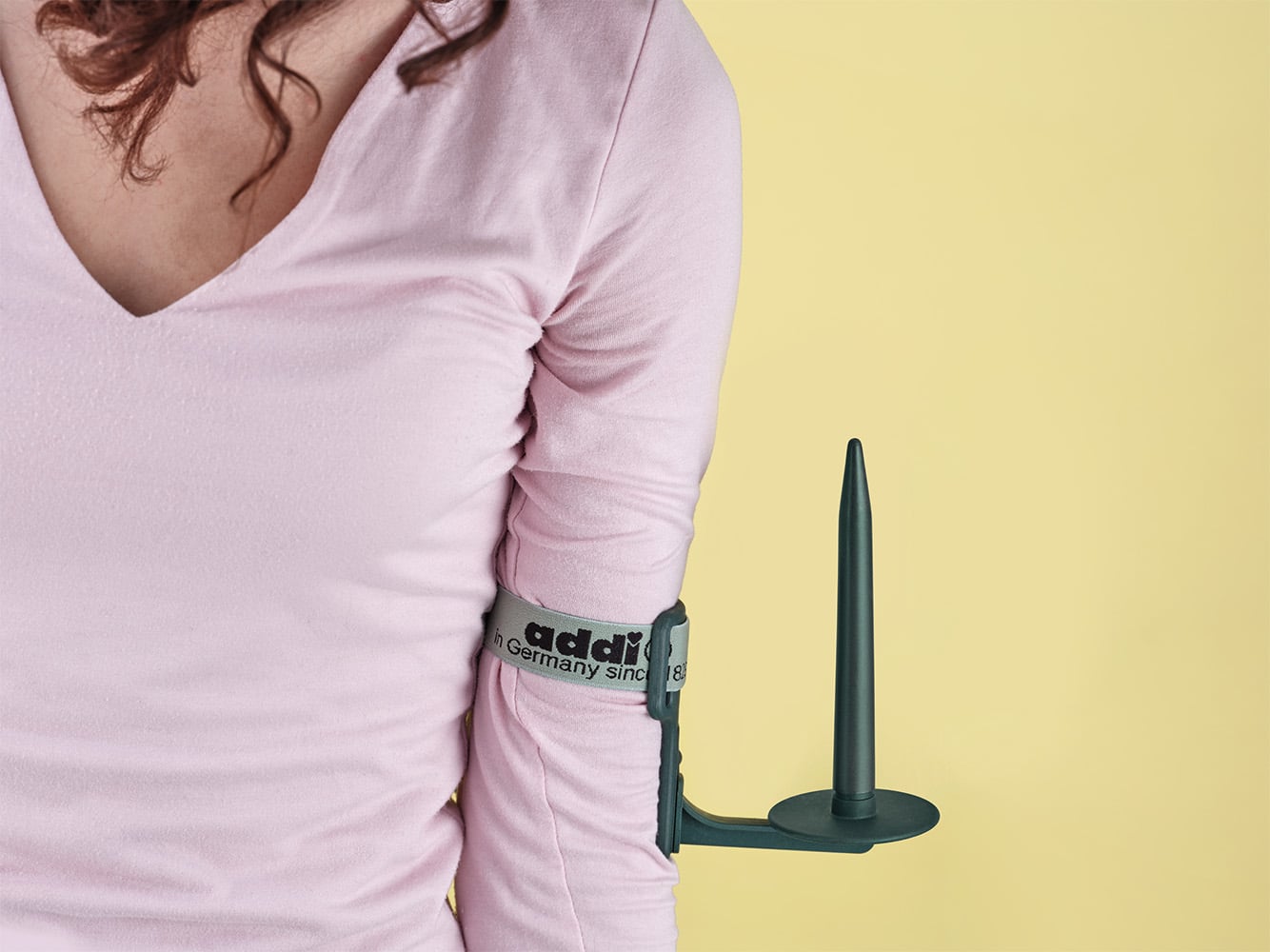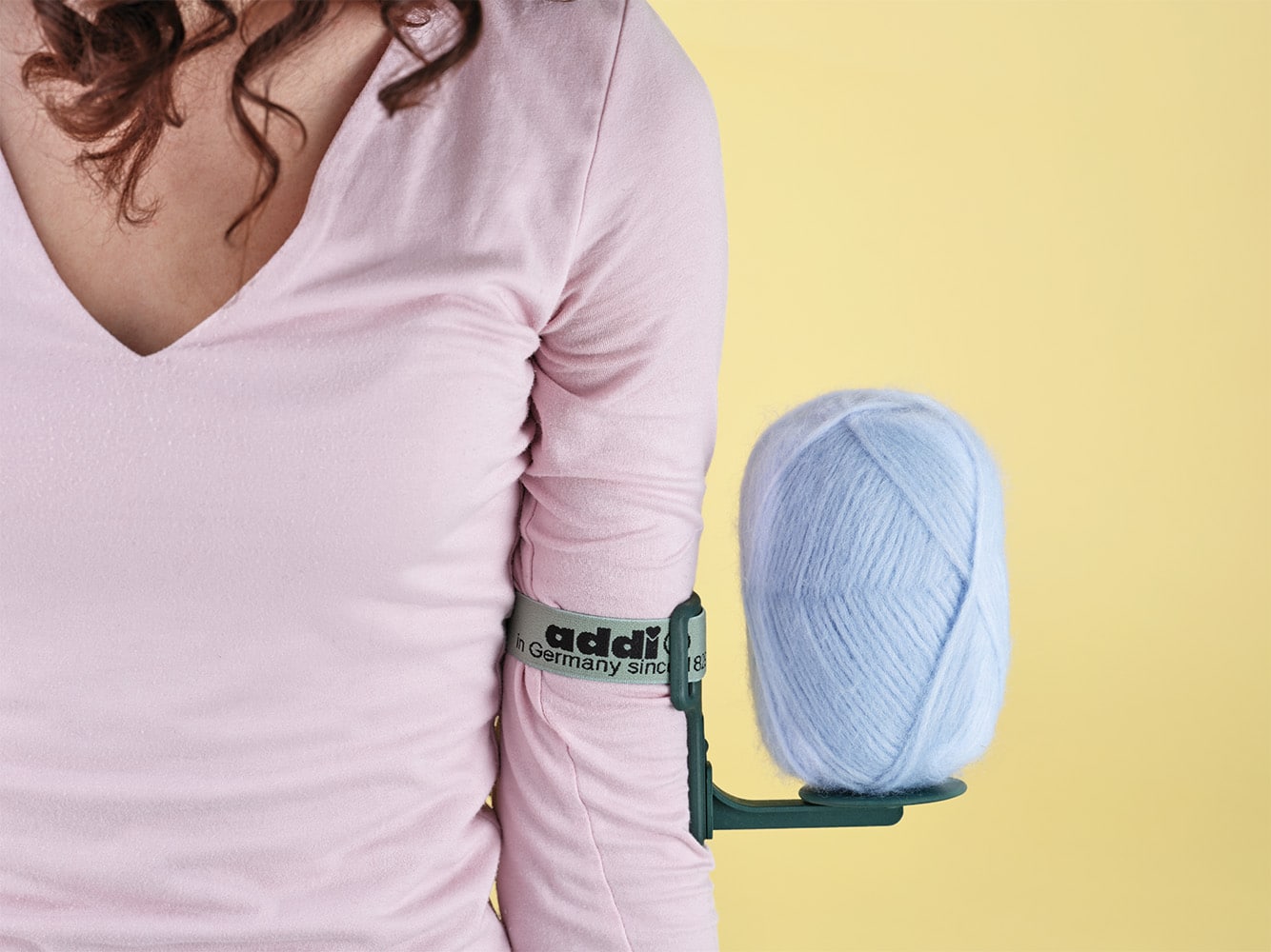 Jederzeit und überall stricken und häkeln! Mit dem patentierten addiYarnArm wird Stricken und Häkeln einfach entspannter – keine verhedderten Wollknäuel mehr in der Tasche oder auf dem Boden – auch nicht unterwegs.