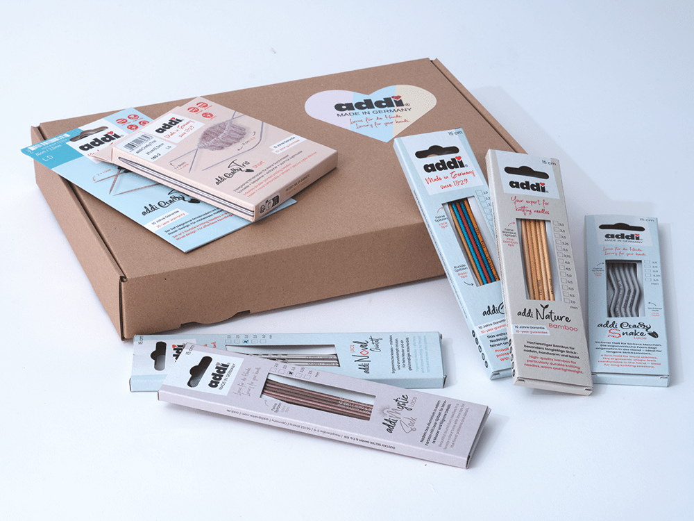 addi-Besonderheiten zum Testen – Stellen Sie Ihren Kunden verschiedene Nadeln, Oberflächen und Strukturen zum Ausprobieren zur Verfügung. In den Marketingpaketen ist jeweils eine Auswahl aller Besonderheiten von addi enthalten – und das zum Vorteilspreis. Denn Vorlieben sind so unterschiedlich wie unsere Hände und Stricktechniken. Die Pakete sind ideal zum: