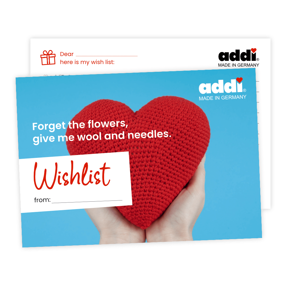 Als Handarbeitsfan ist es nicht immer einfach seinen liebsten konkrete Wünsche zu erklären. Daher stellen wir Ihnen diesen handlichen Wunschzettel im Postkartenformat zur verfügung – verteilen Sie ihn einfach mit ihren Kontaktdaten an ihre Kunden. Schon können Beschenkende bei Ihnen das passende Produkt bestellen.